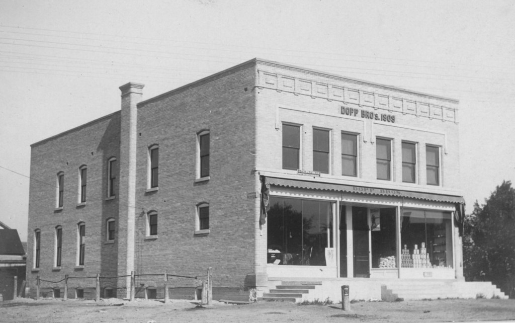 On this same corner was the general store owned by Peters and Kruth that unfortunately would burn in a fire in 1907. Robert Dopp bought the land and in 1908 construction began on a new store of brick.