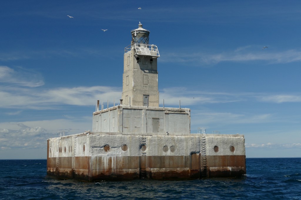 Lansing Shoal Lighthouse, is located in northern Lake Michigan about 5 miles north of Squaw Island and 40 miles west of the Mackinac Bridge in the Straits and 17 mile out of the Suel Choix Point Lighthouse in the upper portion of Michigan. This hazardous shoal out in the lake was also home to a lightship for a time until the ships became larger and the Davis and Sabin locks were completed in 1919 to accommodate larger vessels that could break through the thicker ice. In 1926 Congress approved a permanent lighthouse on the shoal. Four large concrete caissons were placed on a stone foundation. The caissons were filled with stone and capped with a 7 foot thick slabs of steel reinforced concrete. The basement crib was built on top of the foundation. In turn the twenty-seven, 24-in porthole windows, became the deck of the concrete pier. The crib would contain the living quarters and well as engine space. A 37-foot square base of reenforced concrete was paid in the center of the pier. The 59 foot tower was toped with a circular lantern with a third order Fresnel lens. In 1976 the light was automated and the windows, portholes and doors were cemented in, leaving only one access door. The Fresnel lens was removed in 1985 and replaced with a 190mm solar-powered plastic optic. Today the U.S. Coast Guard and local lake birds are the only on site visitors to this light.