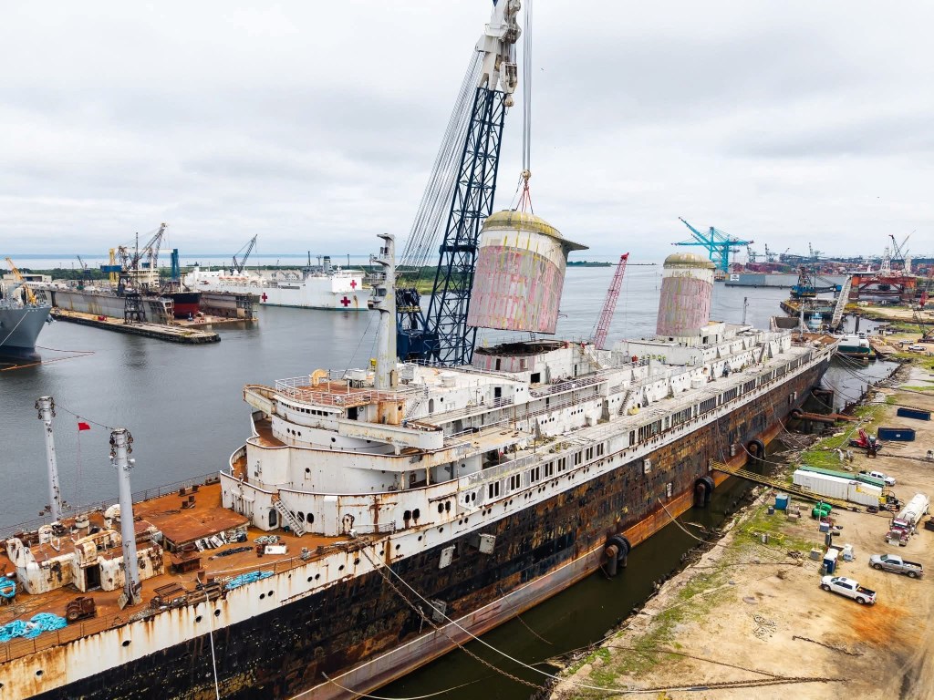 This article today is about the removal of the smoke stacks (funnels) that will be used as a part of the land based museum. For the present time the ship is docked in Mobile, Alabama. Her story will continue but in another form and in a different way.